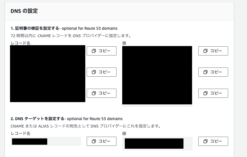 #先ほどの画像の「証明書の検証」(1.の箇所)をCNAMEを設定します。
